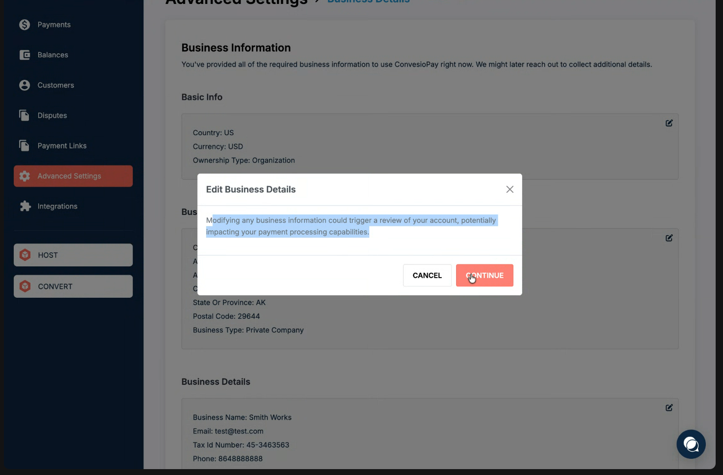 - Select Business Details (any editable section routes to the same flow).